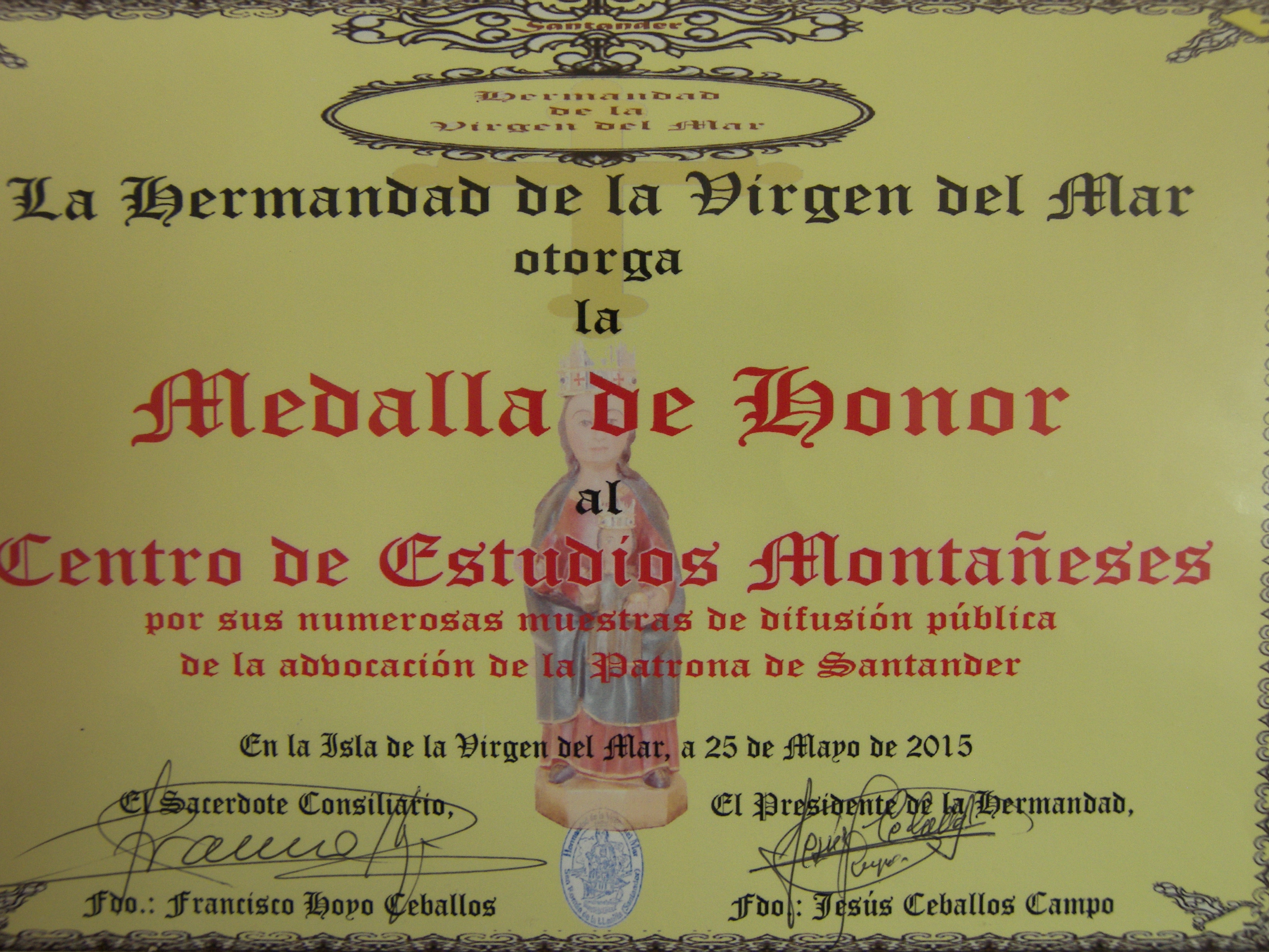 Os convocamos como miembros del CEM, a asistir el lunes 25 de mayo de 2015, festividad de la Virgen del Mar en Santander, a la entrega de la Medalla de Honor de esta Hermandad al Centro de Estudios Montañeses, “en atención a sus numerosas muestras de cariño y difusión hacia nuestra Patrona”, según acuerdo tomado por la Asamblea General de dicha Hermandad.